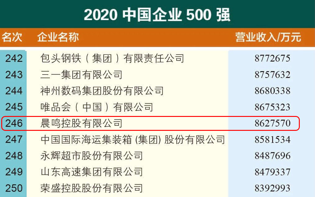 9月27-28日,由中國(guó)企業(yè)聯(lián)合會(huì)、中國(guó)企業(yè)家協(xié)會(huì)主辦的第19屆“2020中國(guó)500強(qiáng)企業(yè)高峰論壇”在河南鄭州召開,備受矚目的“2020中國(guó)企業(yè)500強(qiáng)”榜單正式發(fā)布,晨鳴控股排名第246位,位居行業(yè)榜首。在同期發(fā)布的“2020中國(guó)制造業(yè)企業(yè)500強(qiáng)”榜單中,晨鳴控股位列107位。