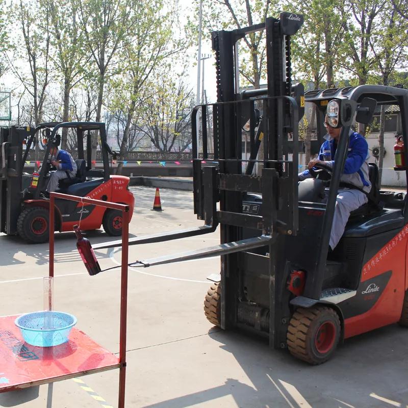 叉車倒紅酒,叉車貨叉尖端裝置一根前端稍彎曲鐵針,用鐵針頂住紅酒瓶底部,參賽選手需要駕駛叉車將紅酒平穩(wěn)倒入杯中。主要比拼選手掌握叉車的平穩(wěn)性和精細(xì)度。